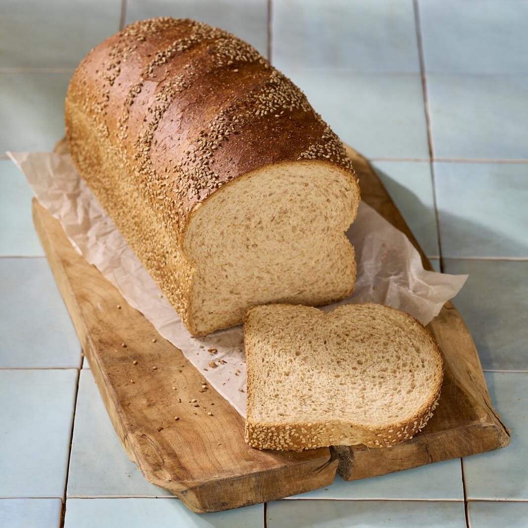 VOLKORENTARWEMEEL (GLUTEN BEVATTENDE GRANEN), water, TARWEBLOEM, gist, bakkerszout, SESAMZAAD (ONGEPELD), weipoeder (MELK), meelverbeteraar(E300, E920), TARWEMOUT, SOJABLOEM, GERSTEMOUTMEEL, emulgator(E471, E482), plantaardige olie (raapzaad), suiker, glucosestroop, plantaardig vet (palm), gebrande suiker, plantaardig vet (palmpit), wei-eiwitconcentraat (MELK), TARWEGLUTEN, MELKEIWIT, botervet (MELK), erwteneiwit, kaliumjodide, antiklontermiddel(E535), conserveermiddel(E202), voedingszuur(E330).