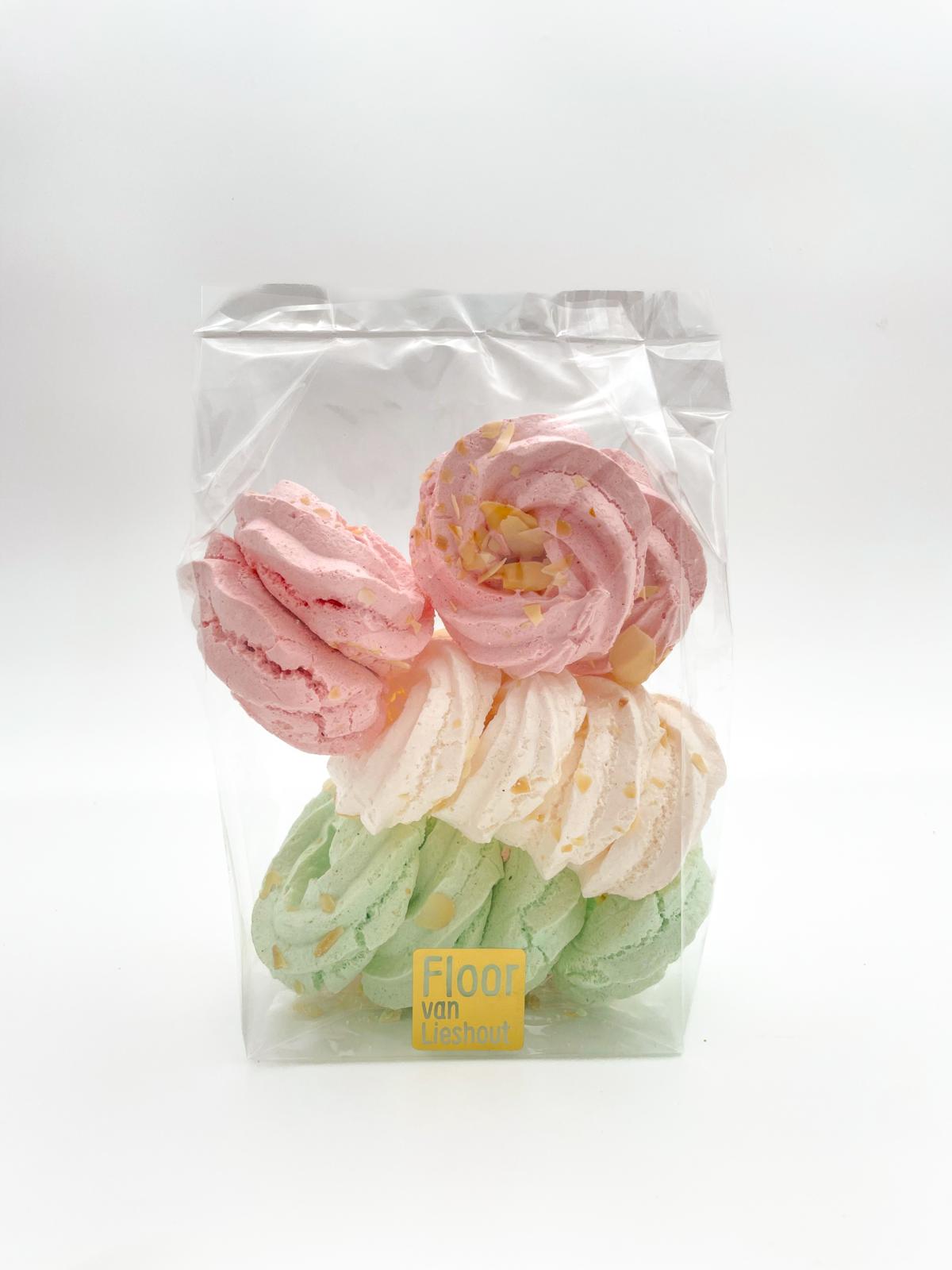 Een zakje gevuld met 12 heerlijke kerstkransjes gemaakt van meringue. In de kleuren wit, roze en groen. Perfect om te delen en natuurlijk voor de feestdagen!