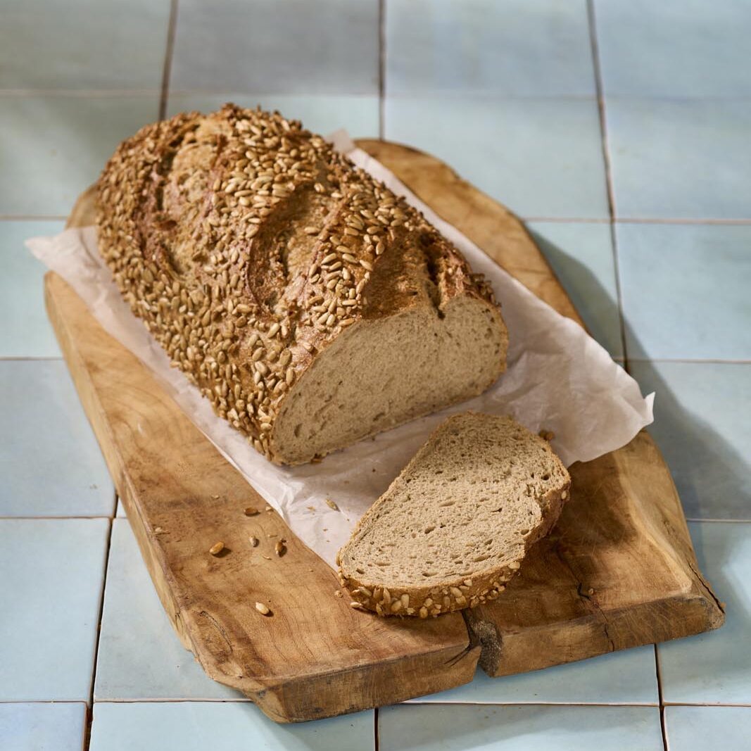 Geniet van ons stevige meergranenbrood, rijk gevuld en prachtig gedecoreerd met zonnepitten. Een voedzame en smaakvolle keuze voor elke maaltijd!
