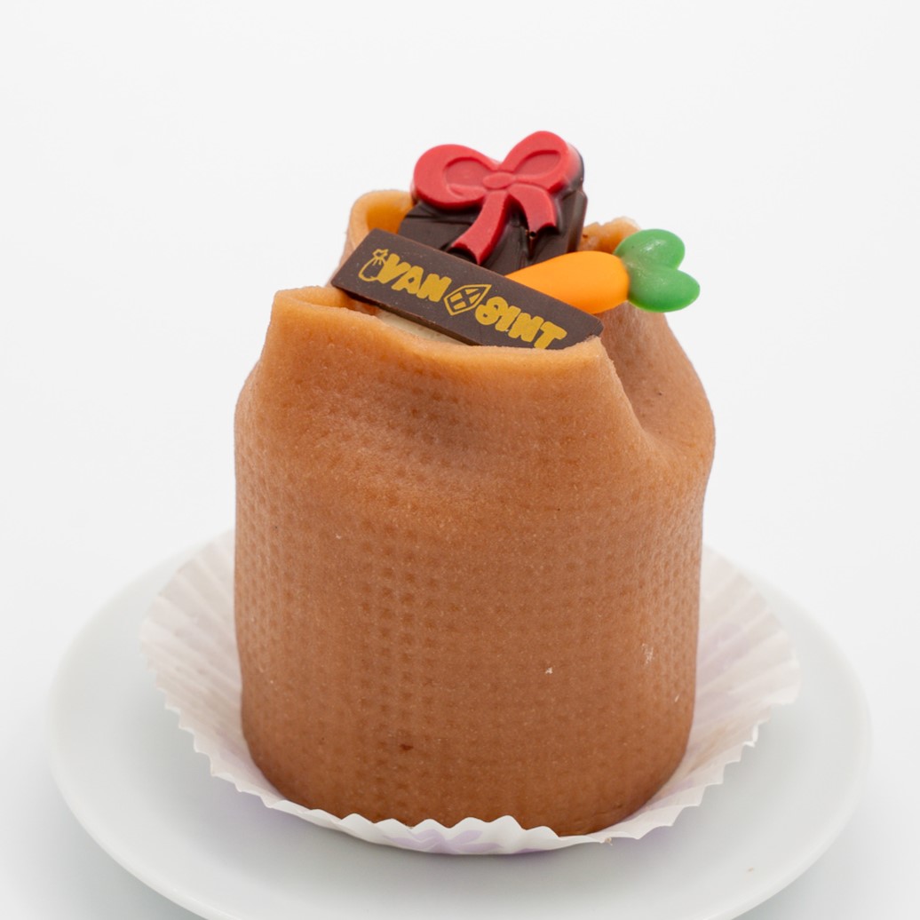 Een heerlijk gebakje van cake en crème. Afgewerkt met een zoete laag bruine marsepein, net als de zak van piet.